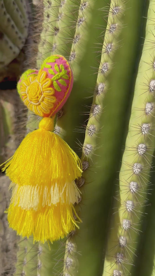 Pink and Yellow Flower Embroidered Heart Pom Pom